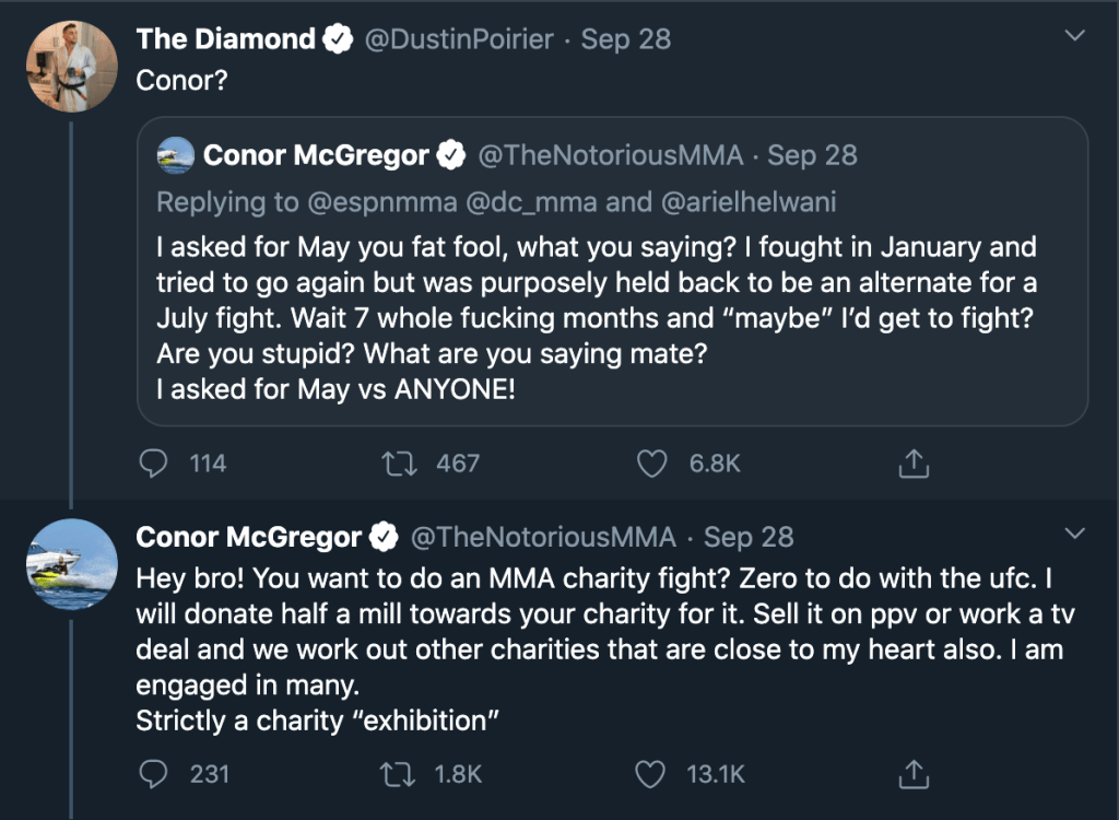 Conor offered a “charity” bout between him and Dustin where the two would fight, and each donate to the other’s charity. This is a great concept in theory, but did anyone actually believe this for one second? McGregor is the richest fighter in history for a reason, he knows exactly how to gain leverage in negotiations and the charity bout was his weapon of choice this time around.