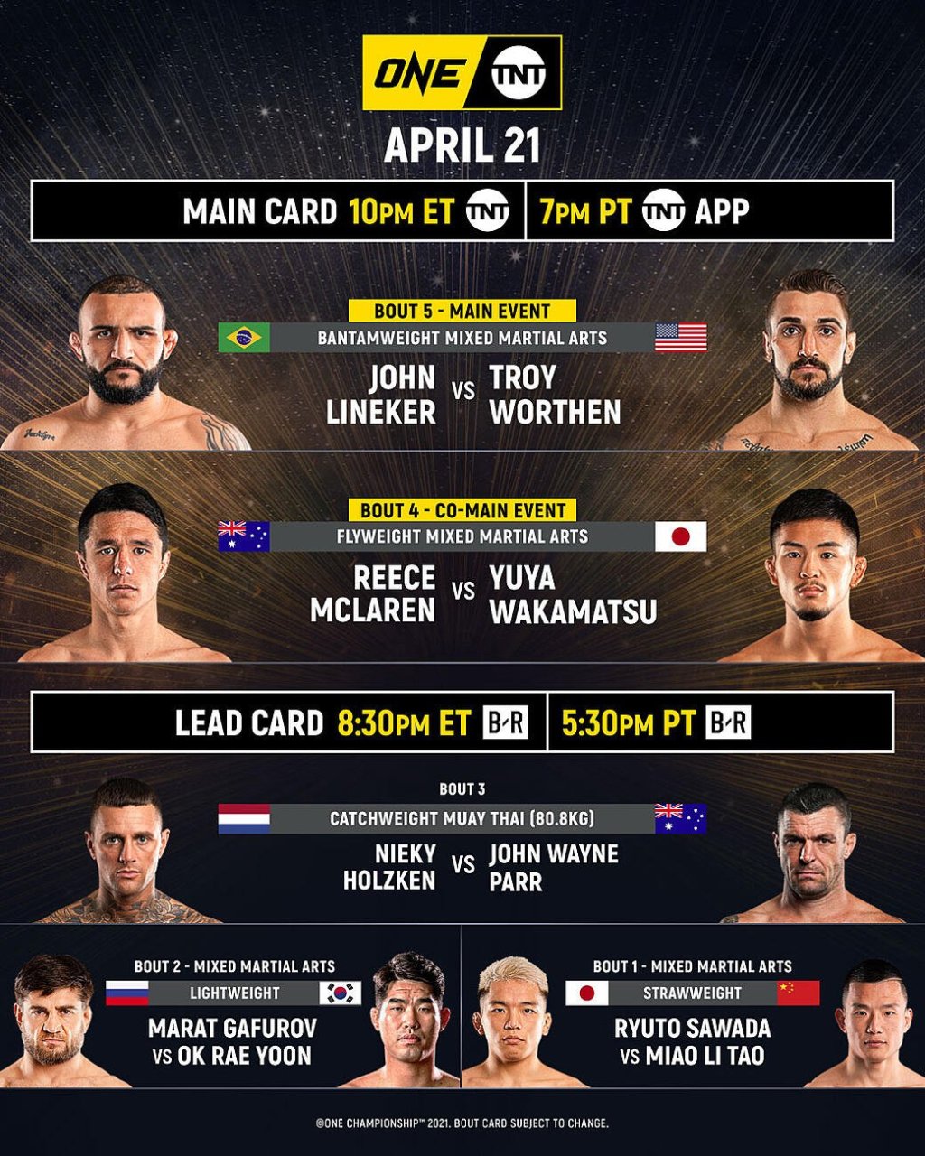 Our main event this week pits new ONE arrival John Lineker against the rising Troy Aikman in a Bantamweight clash that may very well determine a title challenger for Bibiano Fernandes.
