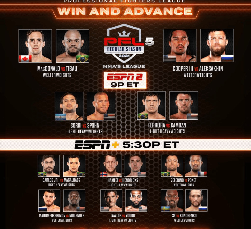 The PFL broke news this afternoon that PFL’s fifth event of the 2021 regular season will be headlined by UFC veterans Rory Macdonald and Gleison TIbua. This event is scheduled to take place Thursday, June 17th and alongside the main event, more great fights were announced for the card. Defending PFL champions, Ray Cooper III and Emiliano Sordi are set to fight Nikolay Aleksahkhin and Dan Spohn, respectively.