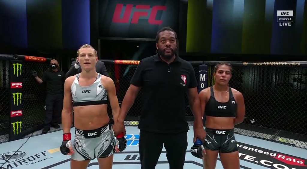 Tabatha Ricci took this fight on very short notice and agrees to fight above her normal weight class in order to capitalize on a chance to fight in the UFC. The size difference was so enormous that it almost didn’t seem fair. Fiorot dominated this fight with heavy kicks and devastating straight punches. She was too big, too long and far too strong for Ricci to compete. Ricci hung in there for as long as she could with admirable toughness but ended up losing by TKO stoppage in the second round.
