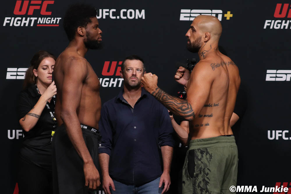 The first five minutes of this fight was interesting. Marques immediately jumps on Nzechukwu’s back and locks on with a body triangle. Nzechukwu remains standing against the cage where he spends the entire five minutes of the opening round standing with Marques on his back. Nzechukwu fights off several choke attempts and punches to survive the round. Round two is more grappling from Marques but by the end he is beginning to show some serious signs of fatigue. In round three Marques comes out and is clearly exhausted and done participating in the fight. Nzechuku starts throwing punch after punch and realizes Marques is not responding so he just pours it on even more. It only takes a short time before the referee steps in to stop the fight. Nzechukwu by round three TKO.