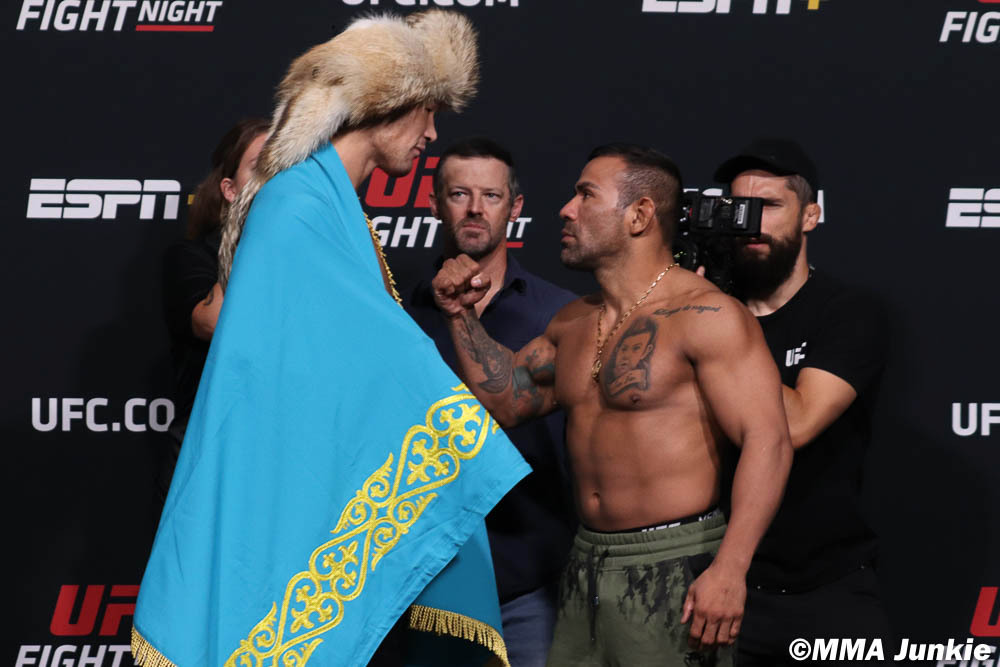 Both fighters start off this fight throwing some hard shots before Rakhmonov is able to get a takedown from the clinch position. Prazeres is able to get back up and attempt a takedown of his own which is unsuccessful. In round two Rakhmonov lands a spinning head kick which stumbles Prazeres. They later end up on the ground where he is able to take the back of Prazeres and sink in a rear naked choke forcing himm to tap. Rakhmonov by second round submission.