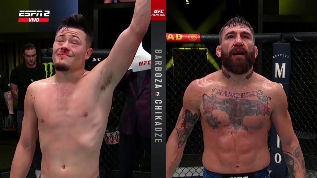 This fight was a nail biter as advertised. Giga comes out in the first and completely dominates. He was throwing lightning fast, extremely hard and with laser precision. In round two however, he shows a very slight decrease in speed and stamina. Barboza takes notice. Barboza increases the pressure and keeps Chikadze on the back foot with his back against the cage. Giga hangs in there although by the time the second round ends he may have lost it slightly. This would leave the fight even going into the third. Round three Barboza sticks with the heavy pressure but somewhere along the way Chikadze lands a hard shot which stumbles him. Chikadze activates his killer instinct and closes in with high intensity. He throws flurries but not carelessly. He lands flush several more times and continues to stumble Barboza. Although Barboza’s toughness was commendable, the ambush was ultimately too much. The referee is forced to stop the fight. Chikadze by third round TKO.
