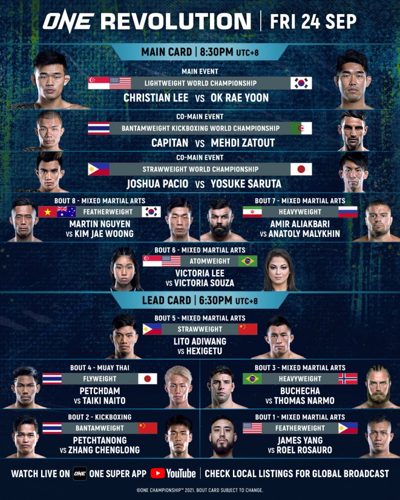 In the main event, reigning ONE Lightweight World Champion Christian Lee defends his World Title against #3-ranked contender Ok Rae Yoon, fresh off his upset victory over Eddie Alvarez. In the second World Title fight of the night, ONE Bantamweight Kickboxing World Champion Capitan Petchyindee Academy puts his belt on the line against striking star Mehdi Zatout. The third and final championship fight is a highly anticipated trilogy bout between ONE Strawweight World Champion Joshua Pacio and former World Champion Yosuke Saruta.