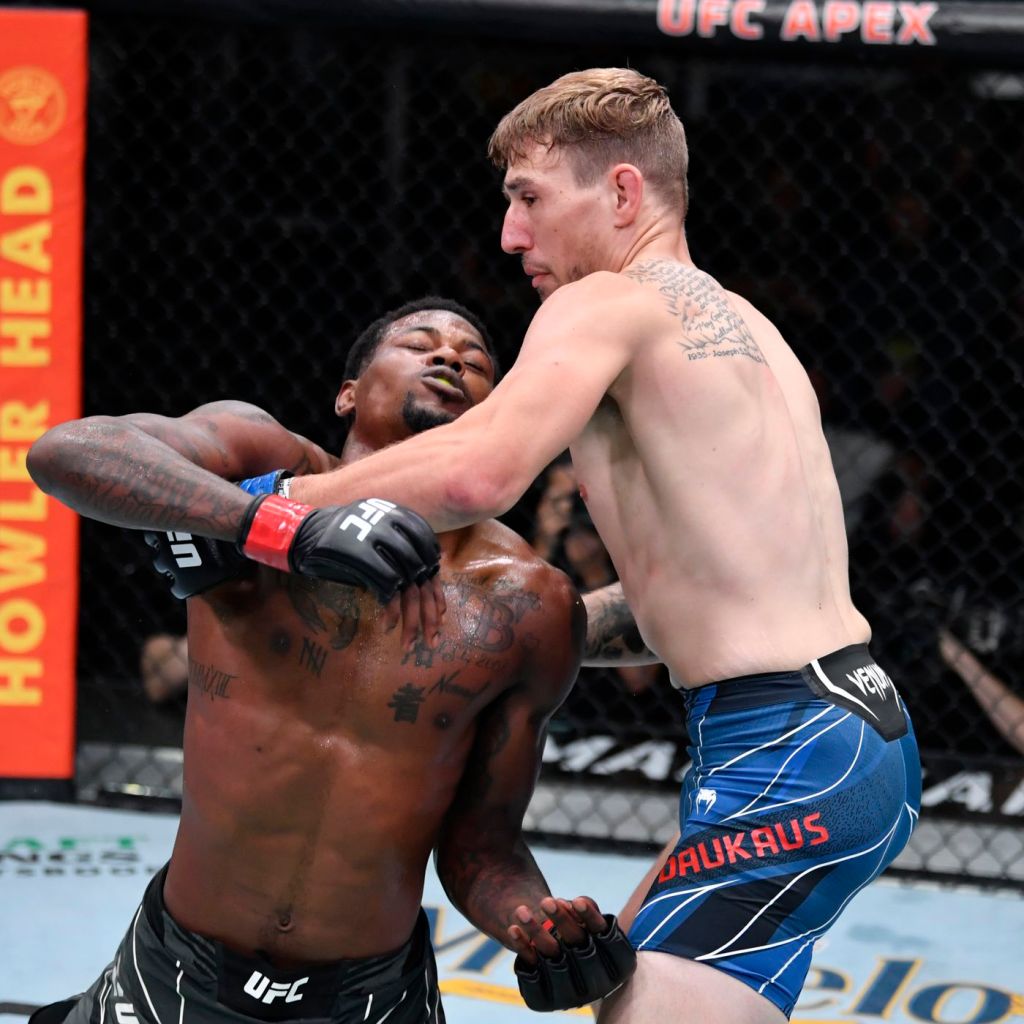 The two met at UFC Vegas 38 this past weekend, and though the bout began with a competitive opening round, the two collided with an accidental headbutt that essentially KO’d Holland. Daukaus did not waste his opportunity, snatching Holland’s back and sinking in a rear naked choke to secure the finish.