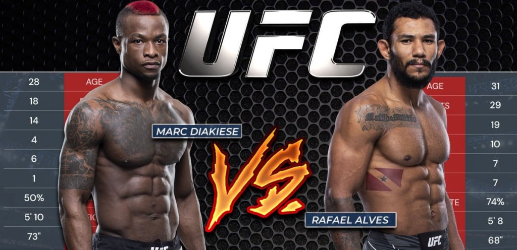 This fight was yet another fast affair making it two consecutive fast finishes to start off the event. Both fighters meet in the middle and in the opening strike Alves accidentally lands a low blow. Diakiese takes a minute to compose himself and the fight resumes. Both fighters dance around each other and take turns blitzing into the pocket with full power strikes barely missing. It doesn’t take long though before Alves is able to land a good flush shot to the face of Diakiese which stumbles him back towards the cage. Alves blitzes in and throws a jump knee at the same time Diakiese is instinctively bending over to attempt a takedown. The jump knee partially lands and then Alves quickly locks up the neck of Diakiese and begins squeezing with all his might. Moments later Diakiese is tapping out. Alves by first round submission.