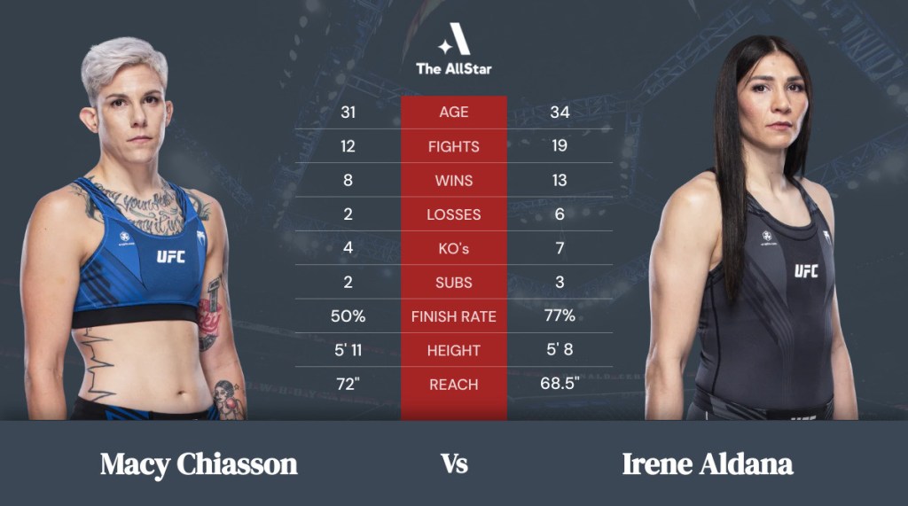 In the opening round Aldana is landing some good strikes. Chiasson throws leg kicks from distance and nice hooks. Despite this it is Aldana who is getting the better of the punching exchanges. Eventually Chiasson initiates a takedown sequence but during the scramble Aldana grabs the arm and has a tight armbar. Somehow Chiasson is able to survive despite it looking like her arm was about to snap. Chiassson escapes but her arm is once again grabbed again and it looks like it might break again. She once again hangs on for dear life and finds a way to survive. A clear cut round in the favor of Aldana. In the second round Chiasson comes out with determination and finally lands a takedown where she can assume the top position. She starts landing ground strikes while Aldana is squirming. Chiasson then is chasing submission while continuing to land shots. Aldana continues to squirm but Chiasson is able to always stay one step ahead and in dominant positions. Chiasson has about a ten second sequence where she is raining down nonstop elbows which prompts the referee to warn her to defend herself. Aldana survives but this is a clear cut round in favor of Chiasson. In the final round the fighters circle each other and trade strikes. Chiasson stays patient and times another beautiful takedown. She is standing over Aldana and throwing occasional strikes but Aldana is throwing wild up kicks. One of the up-kicks she throws in the form of slamming her heel against the body of Chiasson. The heel randomly catches Chiasson in the liver on the way down. The strike immediately buckles Chiasson and she curls up in the fetal position. The body language is clear that this fight is instantly over. The referee stops the fight and Aldana once again finds a way to win despite being greatly tested. Aldana by third round TKO.
