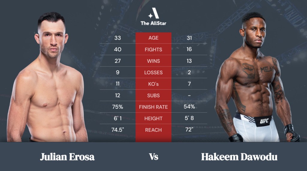 The first round of this bout is the Julian Erosa show. Dawodu is a very respected striker and many felt that if Erosa was going to have success he would need to incorporate the grappling. Surprisingly, Erosa mainly contests the first round on the feet and is actually the one who is having all the success in the striking. He hurts Dawodu on several occasions. Dawodu is wobbled and retreating more than one time but he stays gritty and is able to survive. A clear cut round in favor of Erosa nonetheless. In the second round Dawodu comes out recovered and aggressive. He knows the first round went very poorly for him and seems very determined to turn things around. He starts finding success by being more aggressive and lands some great shots to test the chin of Erosa. Eventually Erosa finds a way to get the grappling going on. He gets Dawodu to the ground and takes the back. Dawodu spends most of the remaining time in the round fighting off rear naked chokes and taking punches from behind. Going into the final round Dawodu will need a finish to get the win. In the third round Dawodu stalks forward but Erosa now is being patient on the outside knowing he has a clear lead in this fight. Dawodu finds a few good moments with Erosa now moving backward but eventually Erosa turns back on the pressure. The round is much closer this time but as the fight comes to a close it becomes extremely clear that Erosa has cruised himself to a very obvious win. Erosa by unanimous decision.